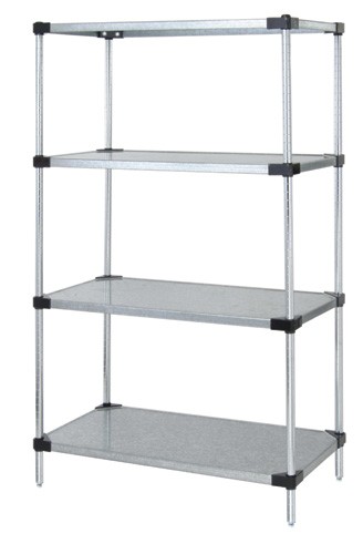 - Solid Shelving Starter Kit, 60"W x 21"D x 54"H, 300 - 600 lb. capacity, includes (4) solid shelves and (4) posts, galvanized steel, NSF, shipped KD