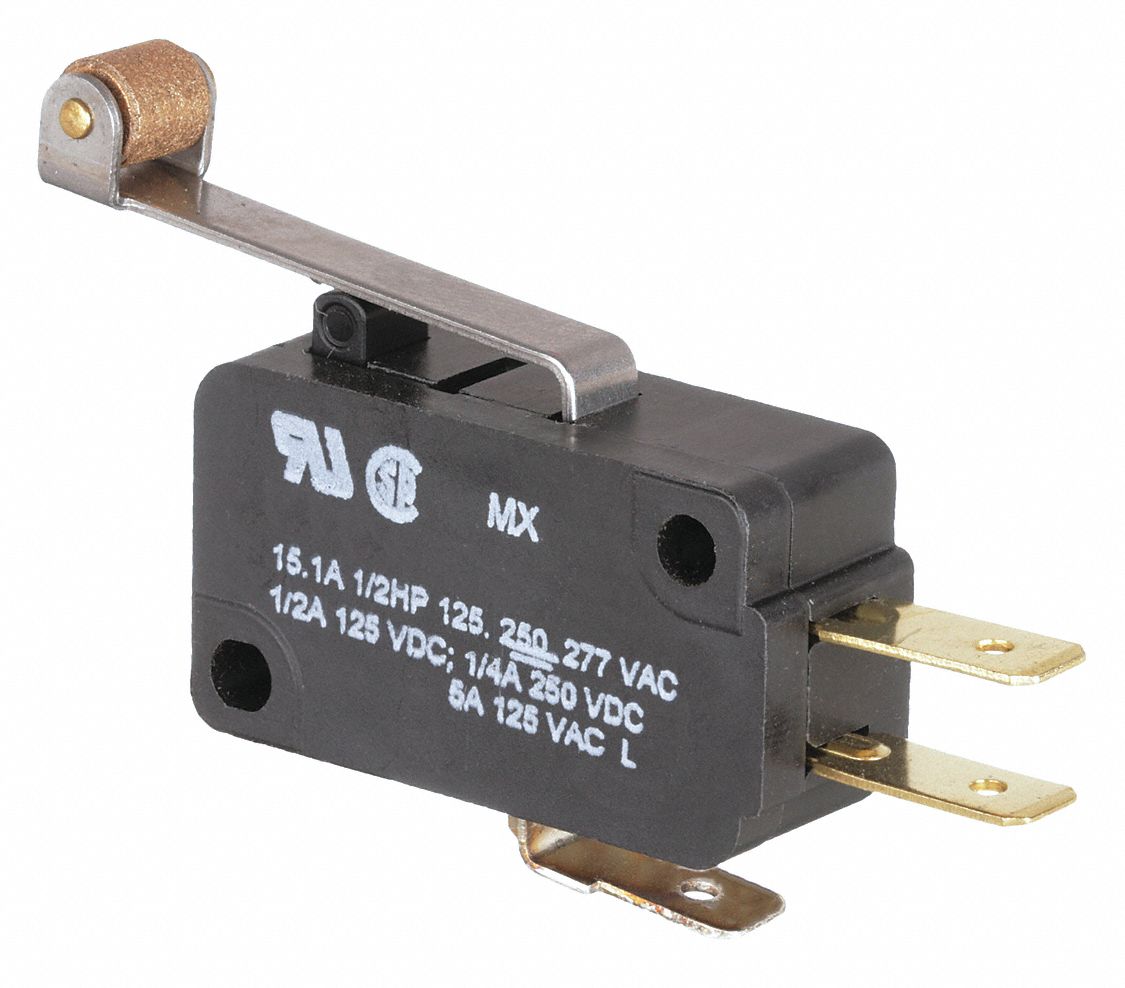 V7 Series Miniature Basic Switch, Single Pole Double Throw Circuitry, 15 A at 277 Vac, Roller Lever Actuator, 0,88 N [3.2 oz] Maximum Operating Force, Silver Contacts, Quick Connect Termination