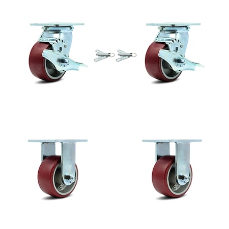 Polyurethane on Aluminum Swivel Top Plate Caster Set of 4 w/4" x 2" Maroon Wheels - Includes 2 Swivel with Brakes and Bolt on Swivel Locks & 2 Rigid - 2800 lbs Total Capacity - Service Caster Brand