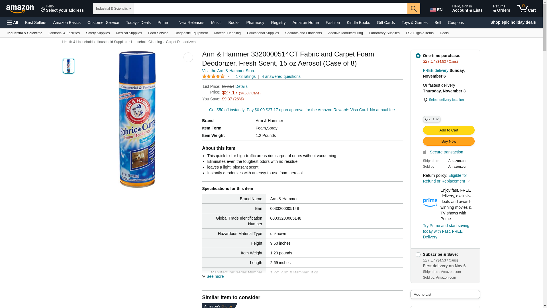 Arm & Hammer 3320000514CT Fabric and Carpet Foam Deodorizer, Fresh Scent, 15 oz Aerosol (Case of 8)