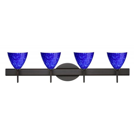 Glass:Blue Cloud, Light Bulb:(4)40w T4 G9 120v Halogen, Finish:Bronze <FONT face=arial>Four-light vanity luminaire featuring handcrafted glass. <UL><LI>Dimmable with standard incandescent dimmer. <LI>Utilizes metal arm assembly and stamped steel body, with plated finish. <LI>Decorative finials can be removed for downlighting applications. <LI>Decorative outlet box cover optional when not required. <LI>Installs directly to a 4†octagonal outlet box, with 1¾†left or right offset. <LI>Canopy allows direct wiring without outlet box, where armoured cable or non-metallic sheathed cable is employed, and the decorative outlet box cover is not required. <LI>Orient upward or downward, wall mount only. </LI></UL></FONT>