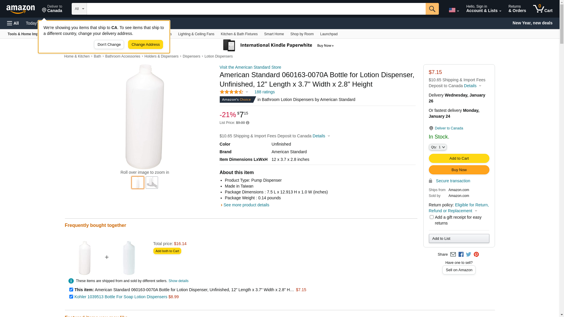 American Standard 060163-0070A Bottle for Lotion Dispenser, Unfinished, 12" Length x 3.7" Width x 2.8" Height