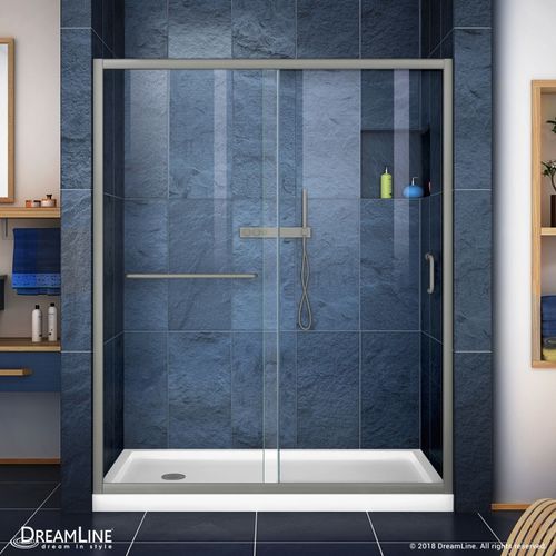 DREAMLINE DL-6971L-04CL INFINITY-Z 32 D X 60 W X 74 3/4 H SLIDING SHOWER DOOR AND SLIMLINE SHOWER BASE KIT, BRUSHED...