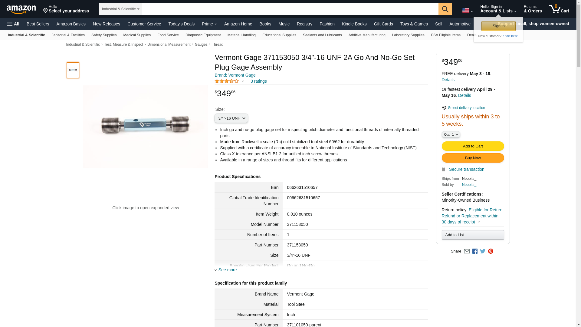 Vermont Gage 371153050 | Go/NoGo Set Plug Assembly, 3/4-16 Unf, 2A | 6ATF4 | Raptor Supplies Worldwide