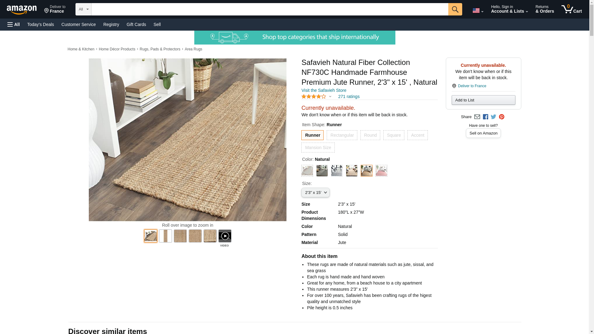 | Feature | These rugs are made of natural materials such as jute, sissal, and sea grass^Each rug is hand made and hand woven^Great for any home, from a beach house to a city apartment^This runner measures 2\'3" x 15\'^For over 100 years, Safavieh has been crafting rugs of the higest quality and unmatched style |