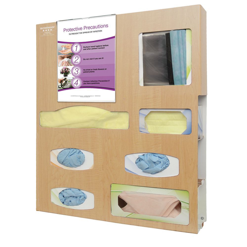 Protective Wear Isolation Bundle BOWMAN PS016-0223 Protective Wear Organizer Holds gowns, aprons, or overalls/jumpsuits, three boxes of gloves, one box of earloop masks, one box of shield masks, and miscellaneous items Keyholes for wall mounting or cutout for use with a BOWMAN Hanger Maple Fauxwood ABS Plastic MP-047 Sign Holder Clip-On Holds 8.5"x11" signage Clear PETG Plastic Made in the USA
