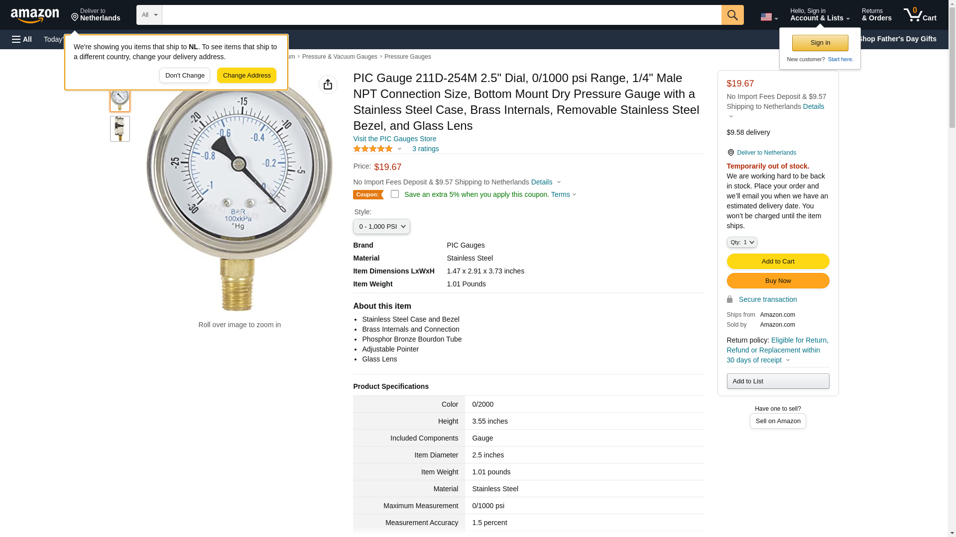 211D-254N PIC Gauges Pressure Gauge, 2-1/2" Dial, 0-1500 Psi, 1/4" Lower Mount, Dry/Fillable, Removable Bezel, Adjustable Pointer, Glass Lens, Stainless Steel Case & Brass Internals