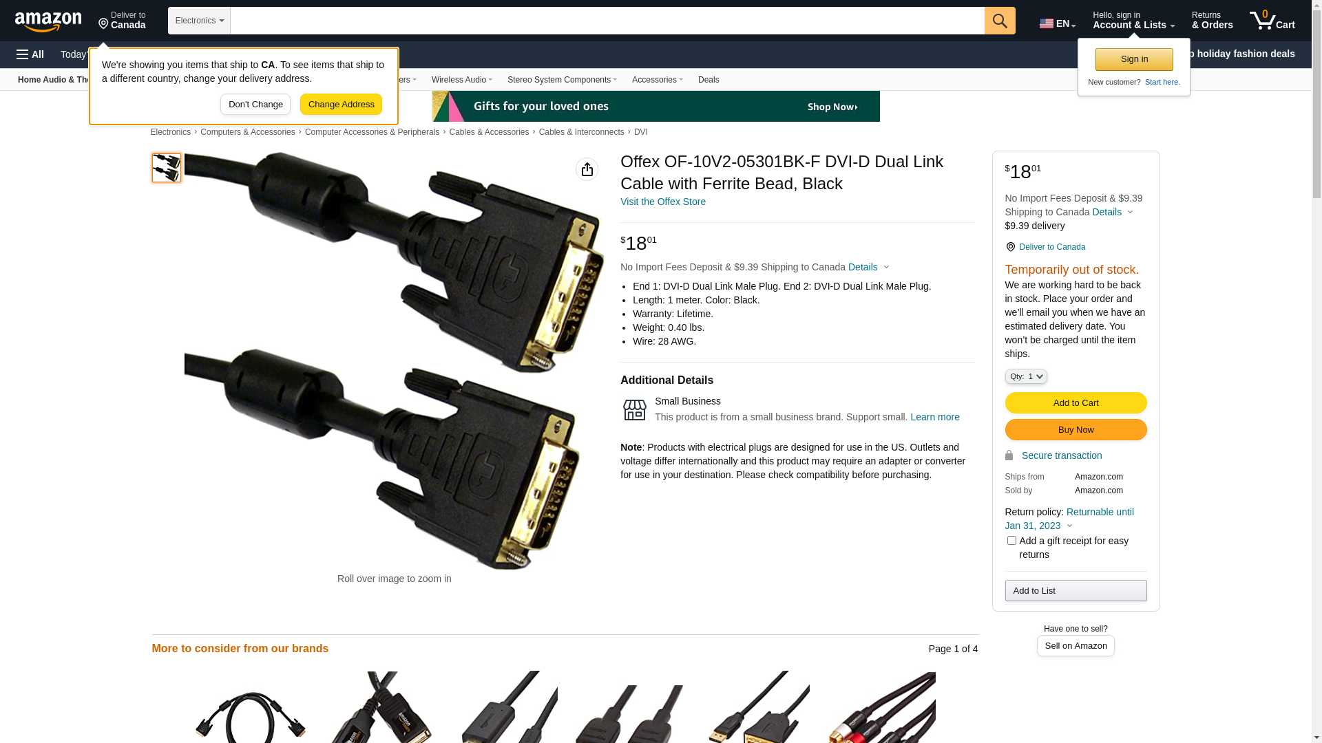 Offex OF-10V2-05301BK-F DVI-D Dual Link Cable with Ferrite Bead, Black. End 1: DVI-D Dual Link Male Plug. End 2: DVI-...