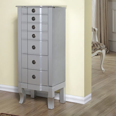CTET1011 <br /> <b>Features</b> <br /> <ul> <li>Flip top mirror</li> <li>6 Felt lined drawers</li> <li>2 Felt lined storage doors (8 Hooks each)</li> <li>Seamless wood finish</li> <li>Drawers can be locked</li> <li>Product Type: Free standing</li> <li>Style (Old): Contemporary</li> <li>Mirror Included: Yes</li> <li>Drawers Included: Yes</li> <li>Necklace/Tie Hooks Included: Yes</li> <li>Locking: Yes</li> <li>Mirror Type: Flip up mirror</li> </ul> <br /> <b>Dimensions</b> <br /> <ul> <li>Overall Height - Top to Bottom: 43"</li> <li>Overall Width - Side to Side: 18.5"</li> <li>Overall Depth - Front to Back: 13.125"</li> <li>Overall Product Weight: 58 lbs</li> </ul>