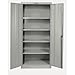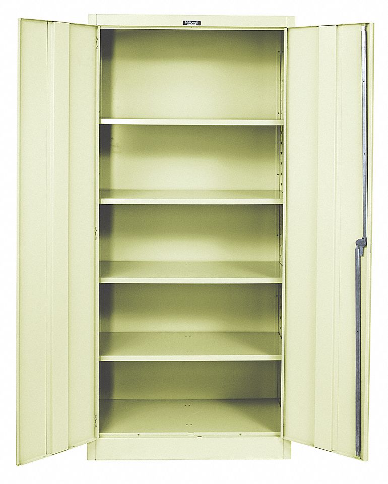 HALLOWELL Commercial Storage Cabinets are perfect for storing office products, maintenance and janitorial supplies or other lightweight items. Tough steel construction features adjustable shelves that accommodate various-sized items. Double doors swing out on 16-gauge continuous piano hinges and are reinforced with full-height stiffener channels for added strength. Doors are factory hung in all-welded frame to ensure accurate fit and proper operation. 22-gauge steel cabinet and shelves. Chrome-plated handle with keyed lock. Corner foot gussets provide extra rigidity and stability. Durable powder coat finish.