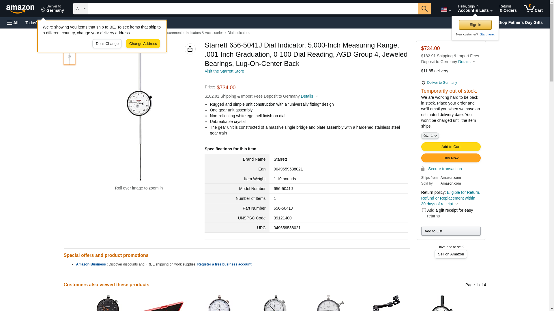 Starrett Dial Indicator- 0 -5.000"- .001" Grad Rohs Compliant: Na - 656-5041J