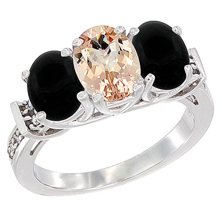14K White Gold Natural Morganite & Black Onyx Sides Ring 3-Stone Oval Diamond Accent, sizes 5 - 10