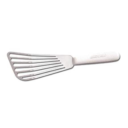 Slotted fish turner;6 1/2 in (L) x 3 in (W) blade dimensions;Stainless steel blade construction;White polypropylene handle;Handle textured provides sure grip;Impervious blade-to-handle seal prevents trapping and spread of bacteria;Blade is hand honed for a superior edge;NSF certified;Made in USA