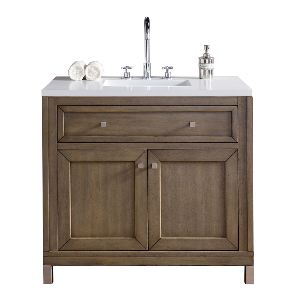 The Chicago 36" Whitewashed Walnut vanity by James Martin Furniture is a wall-mount optional cabinet with mounting brackets and chrome finish legs. This cabinet features tip out drawers for added storage space and soft-close door hinges. <br><br>PLEASE NOTE:<br>*Please refer to top sample images for actual top color.<br>*Mirrors are shown for demonstration purposes and may be ordered separately.<br>*Faucets and accessories are not included.<br>*Cabinets are fully assembled. Pulls may be attached to insides of doors and drawers to prevent damage. On some models, countertops and sinks may be boxed separately and require light assembly.<br>*Granite and Marble tops are made from natural stone and exhibit some variation in color tone and veining. Customers who prefer to avoid natural variation may wish to consider Quartz or Solid Surface tops.<br><br>Two doors for easy access and one tip-out drawer for ample storage.<br>Cabinets are finished inside and out, with a premium undercoat finish for superior moisture and UV resistance.<br>Vanity cabinet may be hung on wall, or chrome finish metal legs may be used for the cabinet to sit on the floor.<br>Cabinet height without legs is 27.6"<br>Cabinets purchased separately will work with your own top<br>Soft-close door hinges<br><br>SPECIFICATIONS<br>Collection Name: Chicago<br>Theme: Contemporary/Modern, Transitional<br>Ships Freight or Ground: Freight<br>Construction Material: Acacia Solids with American Walnut<br>Vanity Base Color/Finish: White Washed Walnut<br>Distressed Finish: Yes<br>Vanity Countertop Material: N/A<br>Countrertop ThicknessN/A<br>Hardware Finish: Satin Nickel<br>Vanity Height: 32.75<br>Vanity Width (Without Top): 36<br>Vanity Depth (Without Top): 23.5<br>Assembly Required: No<br>Number of Shelves: 1<br>Number of Doors: 2<br>Soft Close Hinges: Yes<br>Number of Drawers: 1<br>Soft Close Slides: Yes<br>Backsplash Included: No<br>Backsplash Material: N/A<br>Number of Sinks Included: 0<br>Net Weight of Vanity &am