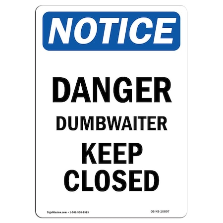 OSHA Notice Sign, Danger Dumbwaiter Keep Closed, 14in X 10in Aluminum