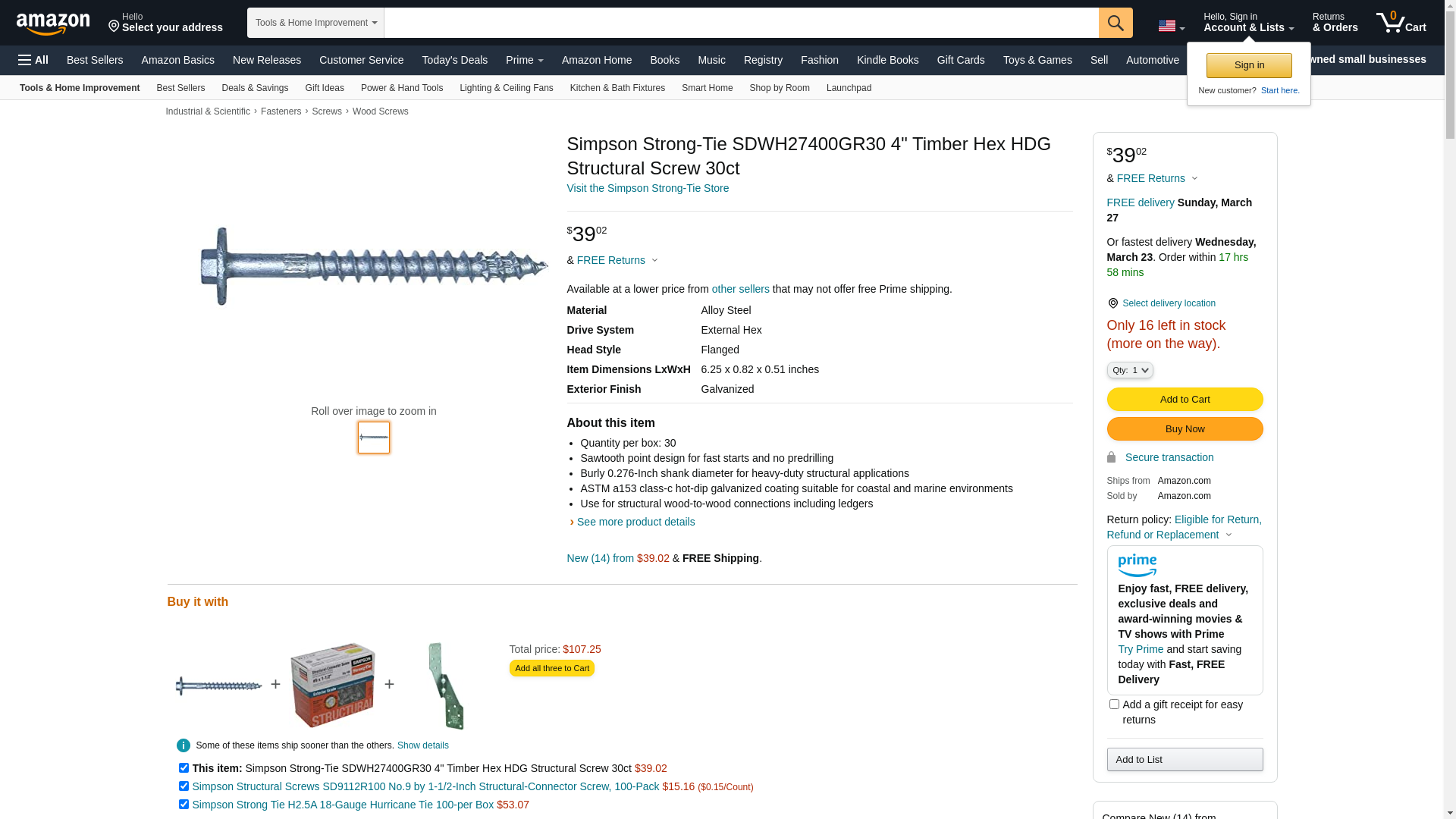 SIMPSON STRONG TIE CO,INC. SDWH27400GR30 SDWH HDG .270 X 4IN 30CT