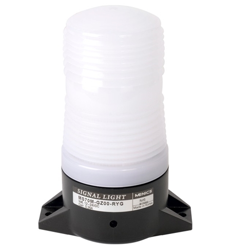 Menics MS70M-GZ00-RYGM 70mm LED beacon light is 12-24V DC with a white lens. Red, yellow, & green colors. Surface mount. Steady & flashing LED with adjustable alarm.