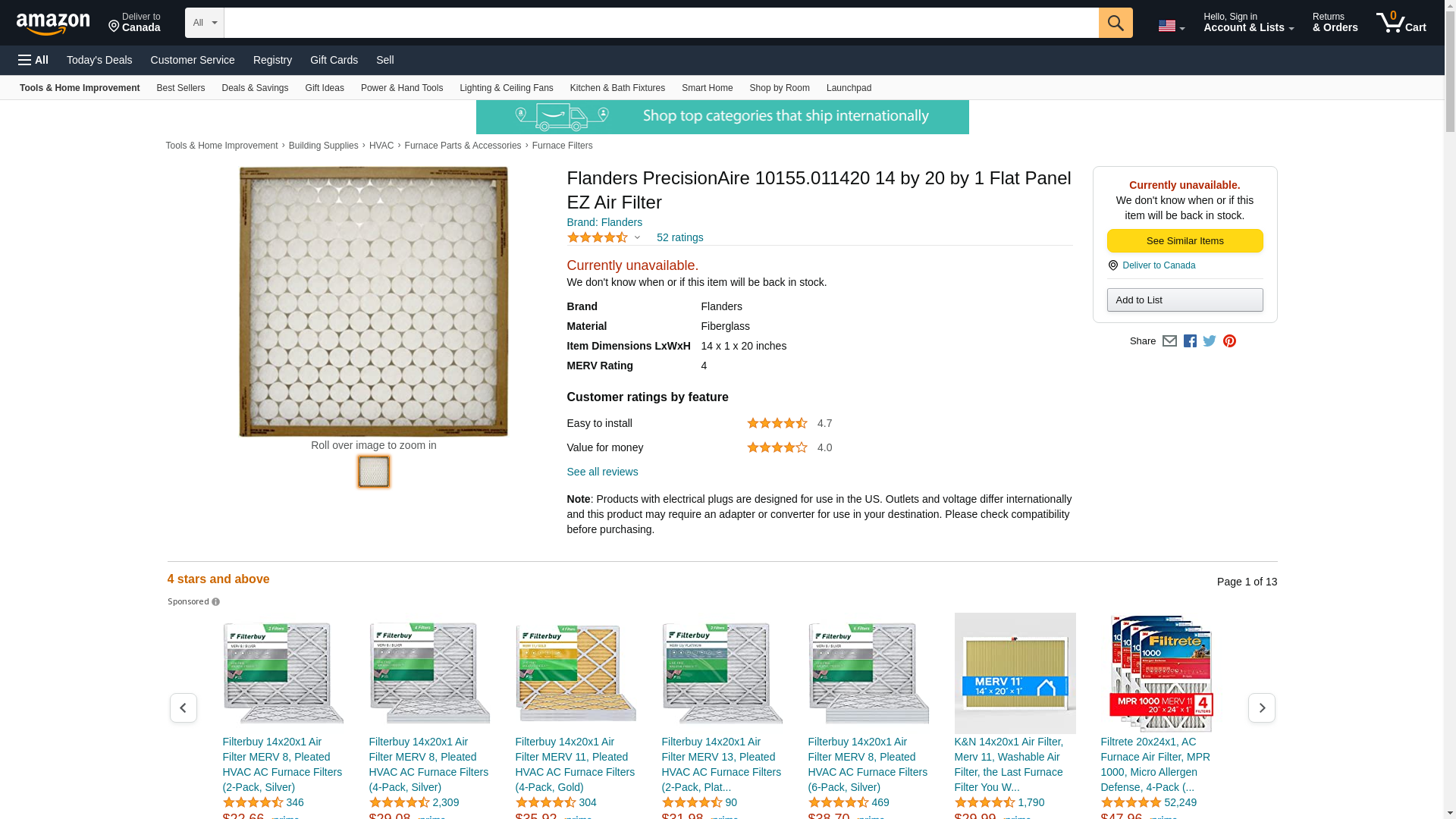AAF Flanders EZ Flow 14 in. H x 20 in. W x 1 in. D Fiberglass 4 MERV Air Filter