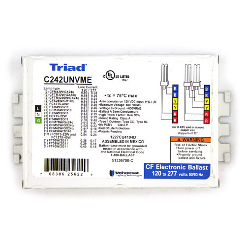 Universal Triad Electronic Compact Fluorescent (CFL) Ballast - Lamps: (1/2) CFM42W/GX24q, (2) FC12T5-40W Circline, (1/2) CFM36W/2G10,(2) CFTR32W/GX24q, (2) CFS28W/GR10q, (2) CFQ/TR26W/GX24q, (2) FT24W/G11, (2) FC9T5-22W Circline, (1) FT55W/2G11,(1&1) FC9T5-22W & FC12T5-40W Circline, (1) CFM57W/GX24q 4-pin lamps, (1) CFM -Input:120-277V -Starting: Programmed Start