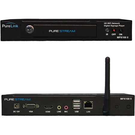 The PureLink <b>MPX100 II</b> high definition media player offers powerful features including a 1.6 GHz Quad-core processor, built-in WiFi, and securable content storage. Together with the MPX Management Software Suite, the MPX100 II provides a complete digital signage solution for applications such as retail, restaurants, hotel lobbies, airport information, public transportation, and more.</p><p>Export playlist content via the built-in WiFI, LAN, or USB options for a self-sufficient, Android-based media playback solution. The MPX100 II offers 1GB of built-in flash memory, as well as a securable (key-lock) SD card slot allowing expansion of up to 128GB for local content storage. The unique fan-less design eliminates noise and protects against debris, providing low-power operation and maximum reliability.</p>