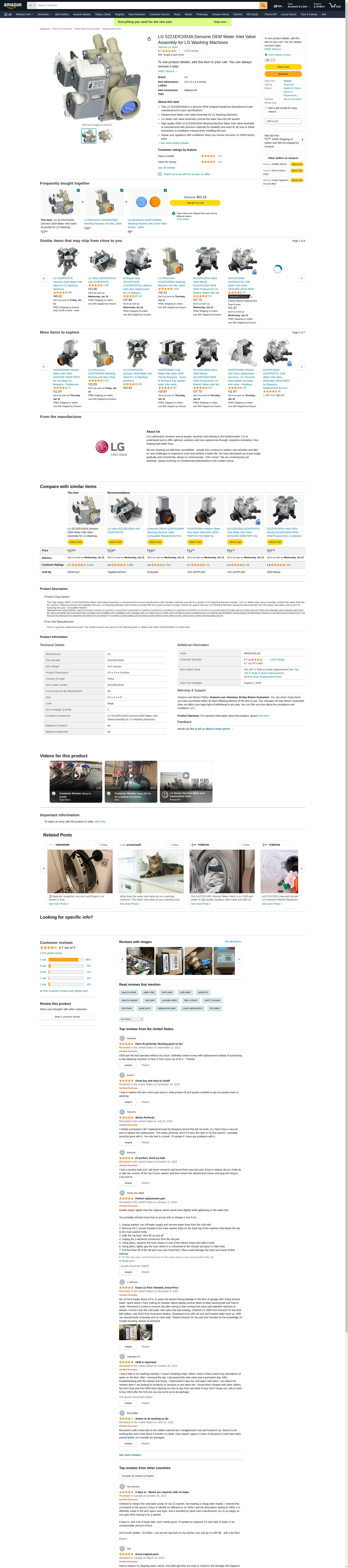 - High quality OEM LG 5221ER1003A Washing Machine Water Inlet Valve Assembly is manufactured with premium materials for durabilty and exact fit, be sure to follow instructions in installation manual when installing this part