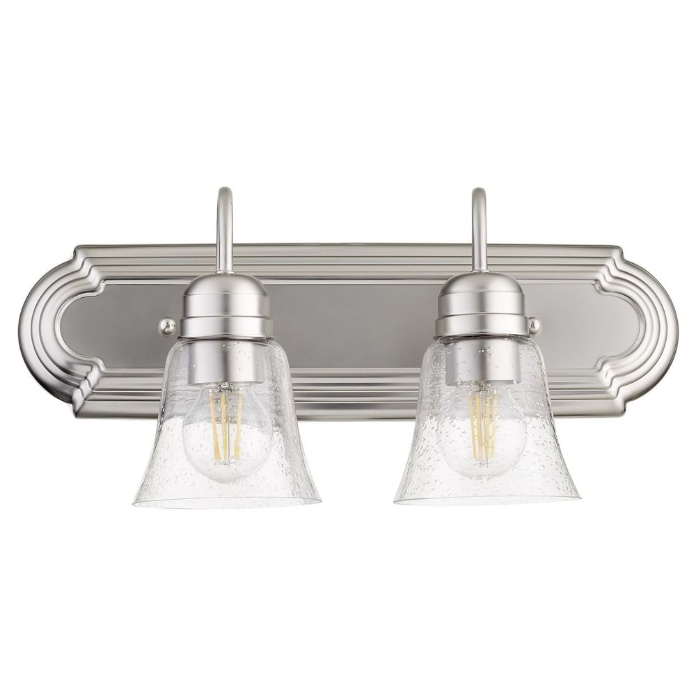 Quorum International 5094-2-265 | 2 Light Transitional Metal Damp Rated Bath Vanity in Satin Nickel Finish with a Clear Seeded Bell Shaped Glass Shade | Easy to Install for a Modern and Classic Style