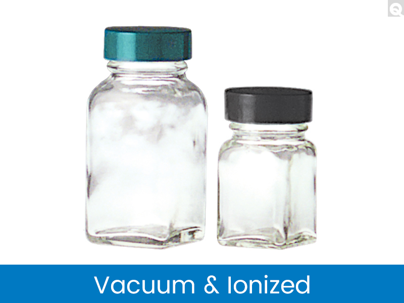 The Vacuum and Ionized Cleaning Process removes contaminants such as loose dirt, carton lint, aerosols, and fine glass particles Compressed air passes through a condensate separator and coalescing filter to remove aerosols and fine dust particles. Then the air passes through an absorbent filter to remove gases. A vacuum then draws the particulate-laden atmosphere out of the container. Individually cleaned closures are immediately placed on the container. The air inside the bottle will not interfere with your product in any way