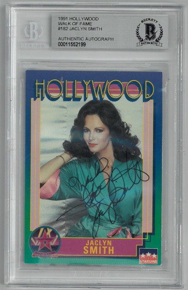 Jaclyn Smith Signed 1991 Hollywood Walk of Fame Starline Card No.182 Much Love Beckett Encapsulated Charlies Angels Jaclyn Smith is an American actress and businesswoman. She is best known for her role as Kelly Garrett in the television series Charlies Angels 19761981, and was the only original female lead to remain with the series for its complete run. Beginning in the 1980s, she began developing and marketing her own brands of clothing and perfume. Jaclyn Smith has hand signed 1991 Hollywood Walk of Fame Starline Card 182 with Much Love inscription. Beckett Encapsulated 00011552199. Specifications. Signed by Jaclyn Smith