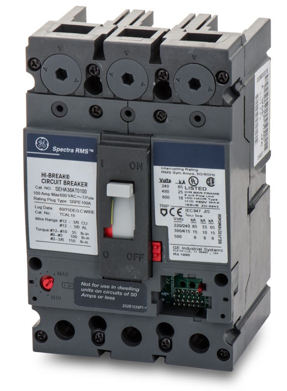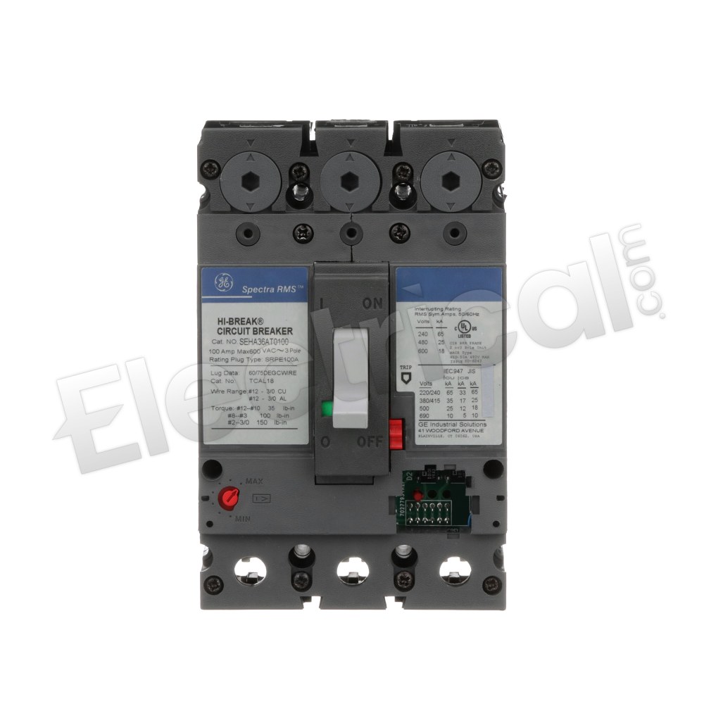 Molded Case, Electronic; Se Frame; 240/480/600 Vac (ul); 220 To 240/380 To 415/500 Vac (iec); 100 Ampere; 3 Pole; Interrupting Rating 65 Kiloampere At 240 Vac, 25 Kiloampere At 480 Vac, 18 Kiloampere At 600 Vac (ul); 65 Kiloampere At 220 To 240 Vac, 15 Kiloampere At 380 To 415 Vac, 6 Kiloampere At 500 Vac (iec); Terminal Not Included; Size 4.12 Inch W X 3.38 Inch D X 6.31 Inch H; Approval Ul, Ce; Spectra Rms[r] Brand; Seh Model