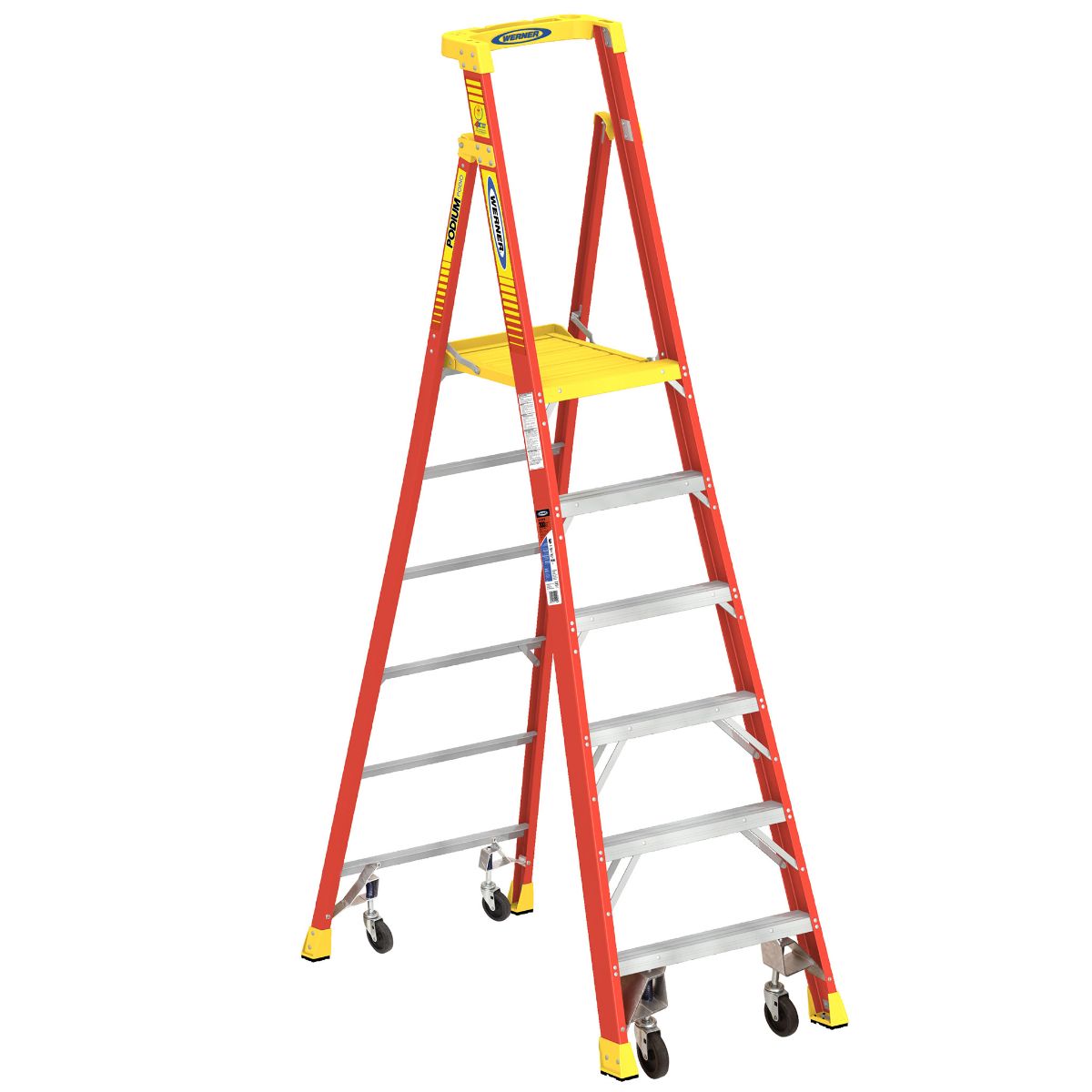 The Type 1A Fiberglass Podium Ladder With Casters from Werner uses the LOCKTOP guardrail to hold a variety of tools, materials and accessories you might need on the .jobsite. It also provides an additional point of contact in the work area. The ladder also boasts a Lock-In System, which lets you attach different holders for convenient tool storage. Feel comfortable and work facing any direction while using the slip-resistant podium ladder thanks to its 4X Work Zone. For your convenience, the ladder boasts four rubber casters that can move 360 degrees, giving you more maneuverability in the work zone than a scaffold or lift. Full aluminum bracing is also used with this six-foot podium ladder for extra durability and safety. Avoid accidental falls with TRACTION-TRED steps.