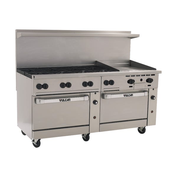 Vulcan 72SS-8B24G 72" Gas Range w/ 8-Burners, 24" Griddle & 2 Standard Ovens | 350,000 BTU Are you tired of running around to different pieces of equipment to make a delicious meal? The Vulcan 72SS-8B-24G 72" Gas Range, 8-Burner, 24" Griddle, 2 Standard O