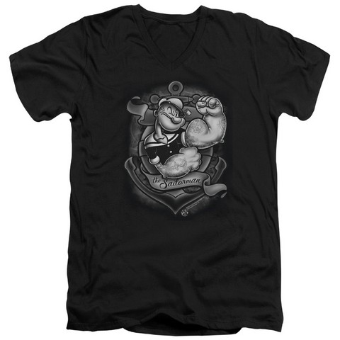 Trevco Popeye-Anchors Away Short Sleeve Adult 30-1 V-Neck Tee, Black - XL