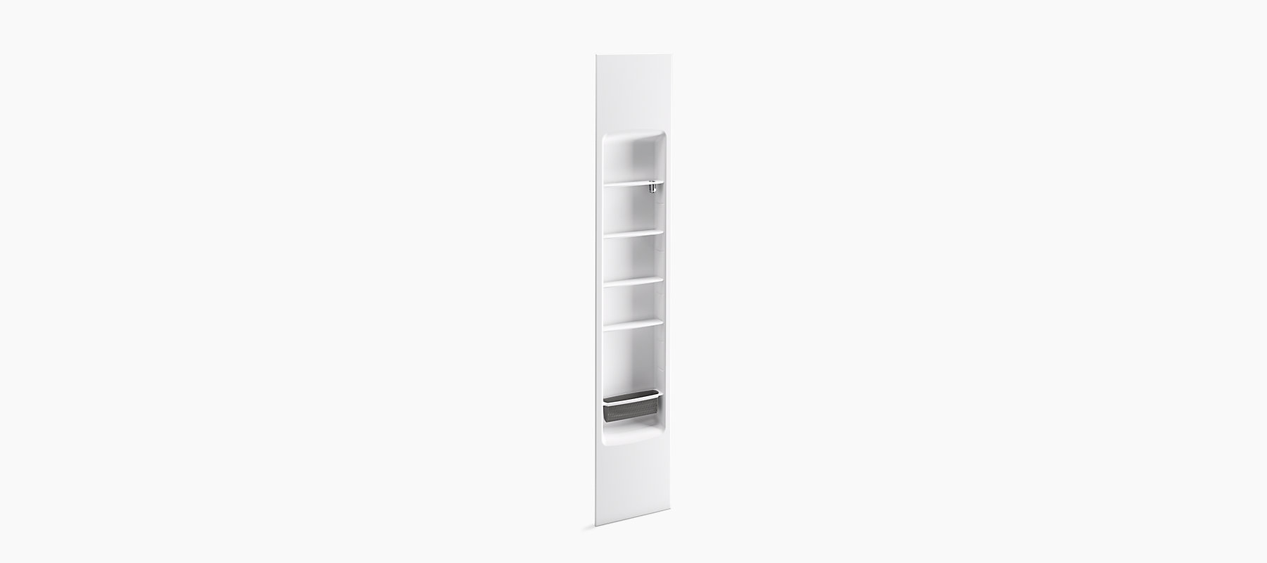 - Shower basket offers concealed storage for small items