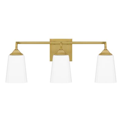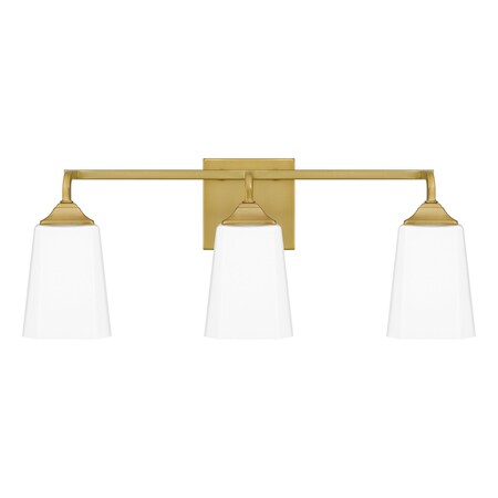 Square details add clean precision to this contemporary three-light bath light from Quoizel. Part of the Thoresby collection, it boasts steel construction with a warm aged brass finish. Its trio of shades feature opal etched glass for soft, diffused illumination at the vanity. A simple horizontal post framework allows the glass to take center stage as this fixture is installed with lights either up or down.