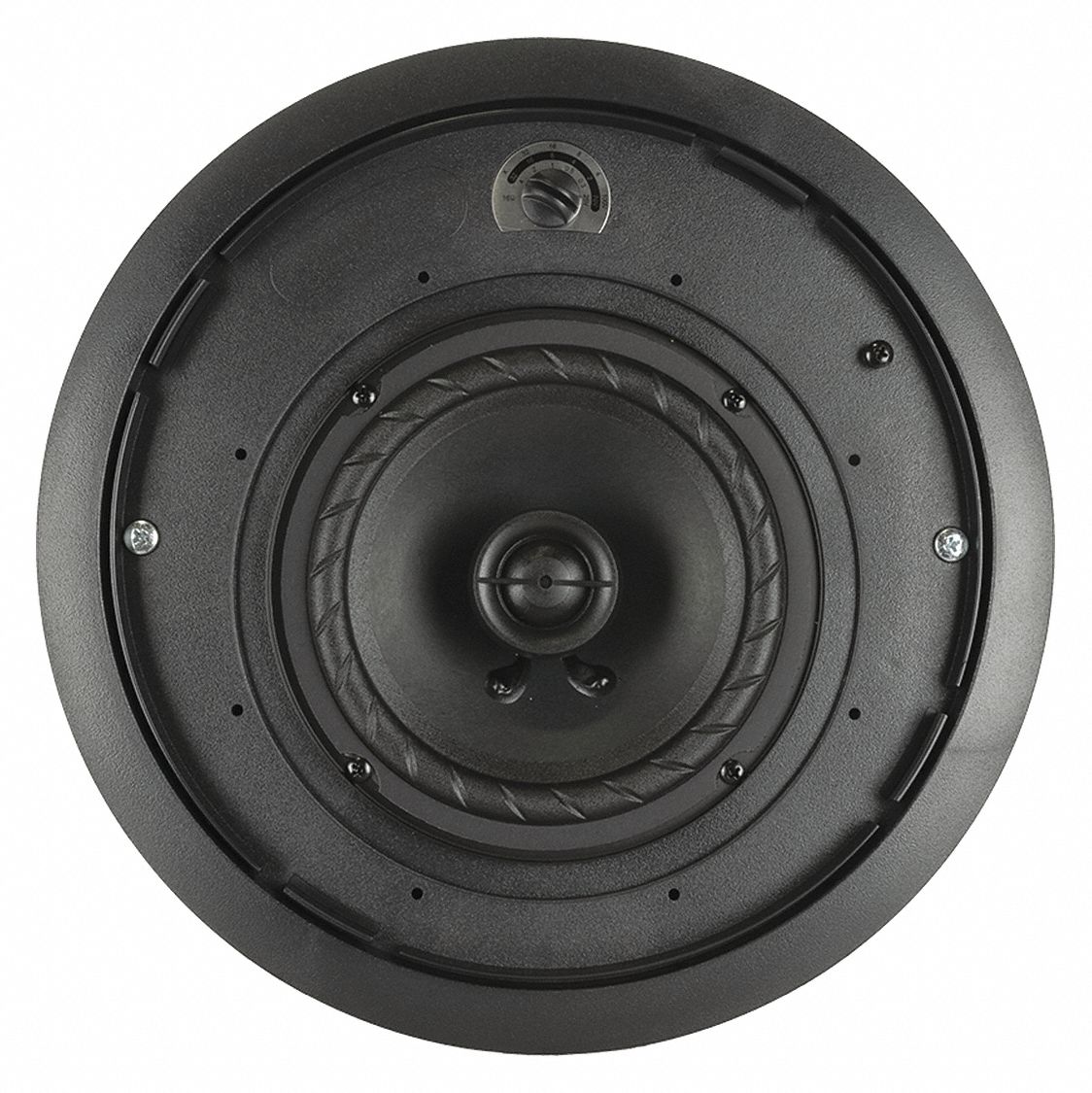 6.5" treated fiber cone with coaxial 1" soft-dome tweeter and SpeedWings rapid install system. In-ceiling. Six-position tap switch with transformer bypass position for 25/70.7/100-volt applications. Black.