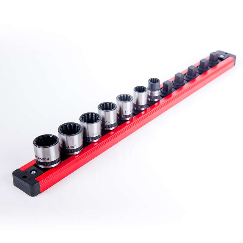 Magnetic Turn-To-Lock Socket Holder With 14 Post Locations For 3/8" Drive Sockets, Red, 18" Long