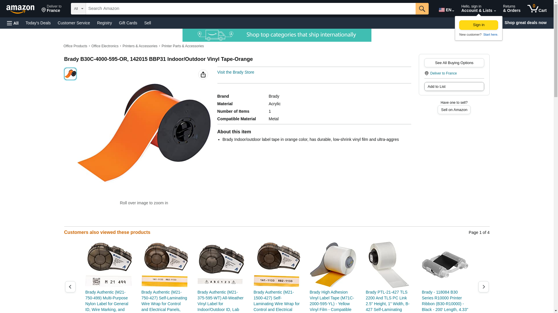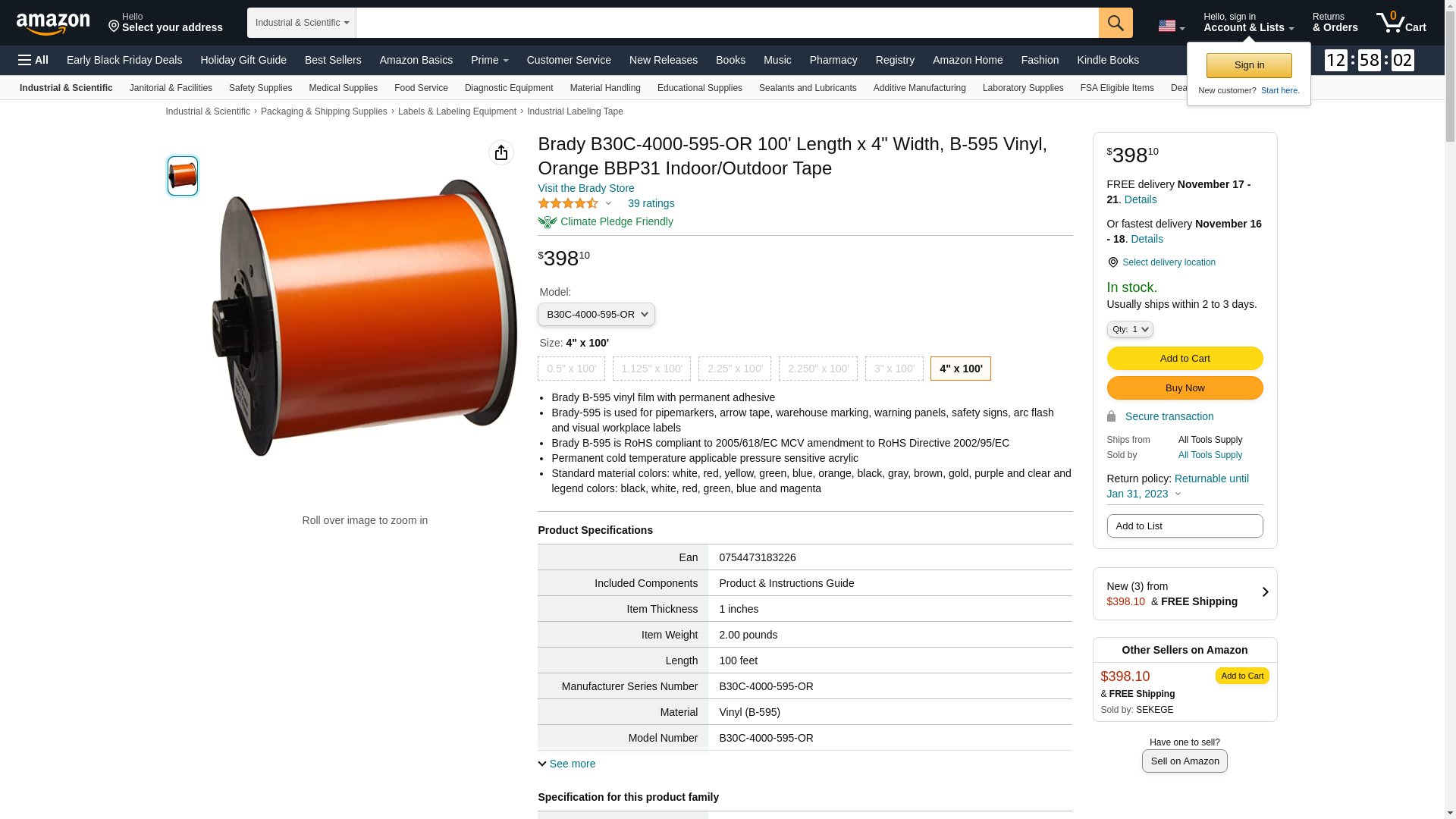 Part NumberB30C-4000-595-ORAgency Approval(s)/ComplianceRoHS Compliant.ApplicationPipe Marking, Arrow Tape, Warehouse Marking, Warning Panels, Safety Signs, Arc Flash and Visual Workplace labels.Brady Material NumberB-595ColorOrangeDescriptionBBP31 Indoor/Outdoor Vinyl Tape - OrangeFinishGlossHeight (in)100 ft.Height (mm)30.48 mLiteratureBBP31 Sign and Label Printer BrochureMaterial DescriptionVinyl Film with Permanent AdhesiveMaterial TypeVinylPrinter CompatibilityBBP30, BBP31, BBP33, BBP35, BBP37Product Number142015Qty Per RowContinuousQTY/UOM1/RollRecommended Ribbon SeriesR-10000 SeriesSafety Catalogpg. 358Size4.000" x 100'Special PropertiesPermanent acrylic adhesive can be applied at cold temperatures.Suggested Ribbon Part#B30-R10000UPC Code75447318322Width (in)4.000"Width (mm)101.600 mmRoHS CompatibilityPass 2011/65/EU