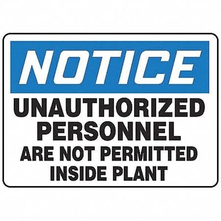 Accuform MADM873VA, 7" x 10" OSHA Notice Safety Sign "Unauthorized Personnel ..." Aluminum Legend "Unauthorized Personnel Are Not Permitted Inside Plant" Features: Stands up indoors and out Thin enough to conform to curved surfaces .032 inches thick for strength and flexibility Finished with four mounting holes