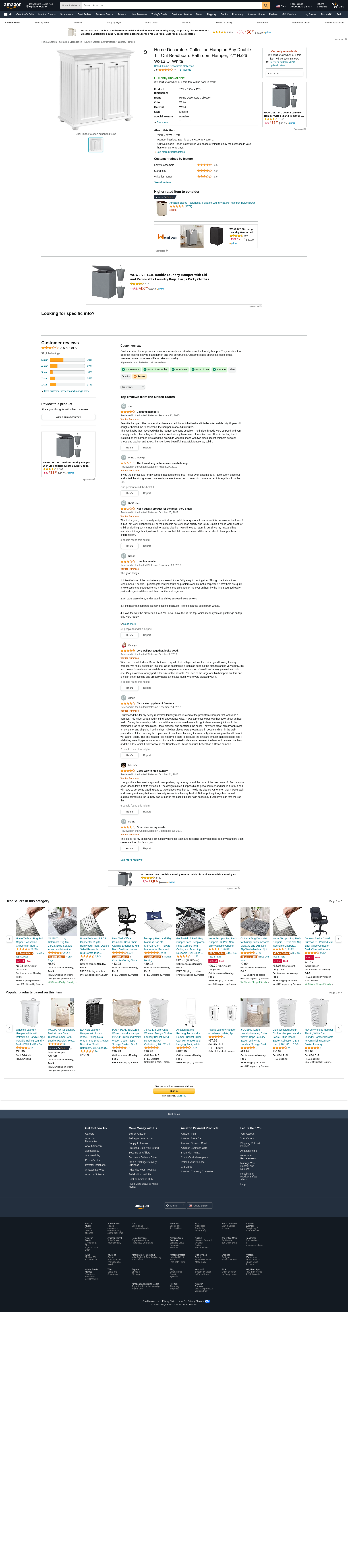 From the Hampton Bay Bath Collection, this double tilt-out hamper is durably crafted to hold up to frequent use. The timeless style blends well with many bath decorating concepts for a versatile, long-lasting laundry hamper. Two compartments for easy sorting. Features stylish details like bun feet and chrome-look hardware. Also works great as a recycling bin. Actual size is 27"Hx26"Wx13"D
