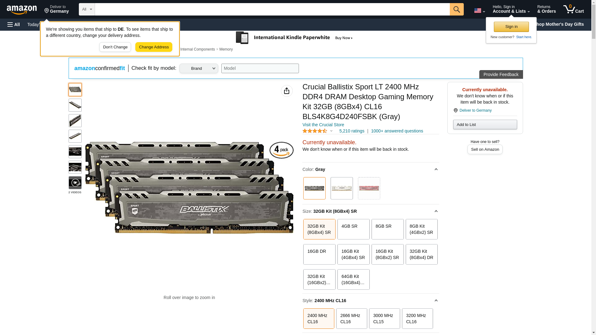 Ballistix Sport LT 32GB Kit (8GBx4) DDR4 2400 MT/s (PC4-19200) SR x8 DIMM 288-Pin - BLS4K8G4D240FSBK (Gray)