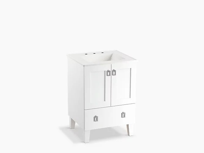 KOHLER K-99527-LG-1WA POPLIN 24 INCH TWO DOORS AND ONE DRAWER BATHROOM VANITY CABINET WITH LEGS, LINEN WHITE