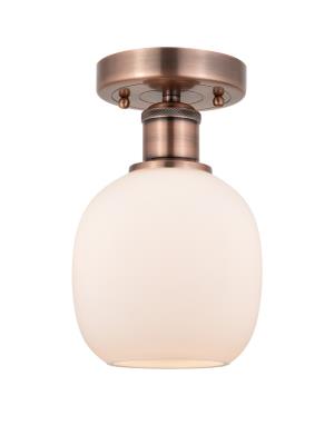 INNOVATIONS 616-1F-AC-G101 Belfast 1 6 inch Flush Mount Antique Copper. Style: Industrial, Modern Contempo, Restoration-Vintage, Transitional . Collection Name: Edison. Metal Finish(Body): Antique Copper. Metal Finish(Canopy/Backplate): Antique Copper. Material: Steel, Cast Brass, Glass. Dimension(in): 9.75(H) x 6(W) x 6(Dia). Bulb: (1)60W Medium Base Incandescent(Not Included). Voltage: 120. Dimmable: Yes. Color Temperature (Kelvin): 2200. Color Rendering Index (CRI): 99.9. Lumens: 220. Life Expectancy (Hours): 2000. Glass Shade Description: Matte White Belfast. Glass Type: Frosted. Shade Shape: Globe/Orb. Glass or Metal Shade Color: Matte White. Shade Material: Glass. Shade Dimension(in): 6(W) x 6(H). Fitter Measurement (Glass Or Metal Shade Fitter Size): Neckless with a 2.125 inch opening. Canopy Dimension(in): 0.75(H) x 4.5(Dia). Sloped Ceiling Compatible: No. California Proposition 65 Warning Required: Yes. UL/ETL Certification Type: Damp Location.