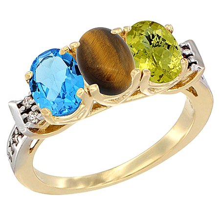 10K Yellow Gold Natural Swiss Blue Topaz, Tiger Eye & Lemon Quartz Ring 3-Stone Oval 7x5 mm Diamond Accent, sizes 5 - 10