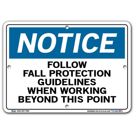 Vestil SI-N-53-A-AL-040 Notice Sign Aluminum .040" Overall Size 10.5"W x 7.5"H Follow Fall Protection Guidelines When Working Beyond This Point , 7.5" Height, 10.5" Wide, 0.04" Length