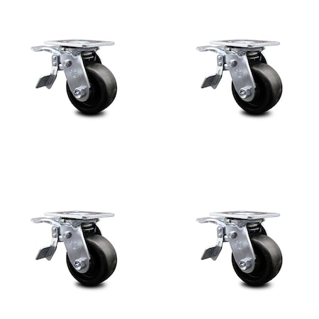 Glass Filled Nylon Swivel Caster w/Main. Free Bearings Set of 4 w/4" x 2" Black Wheels - Includes 4 Swivel w/Total Lock Brakes - 4800 lbs Total Capacity - Service Caster Brand