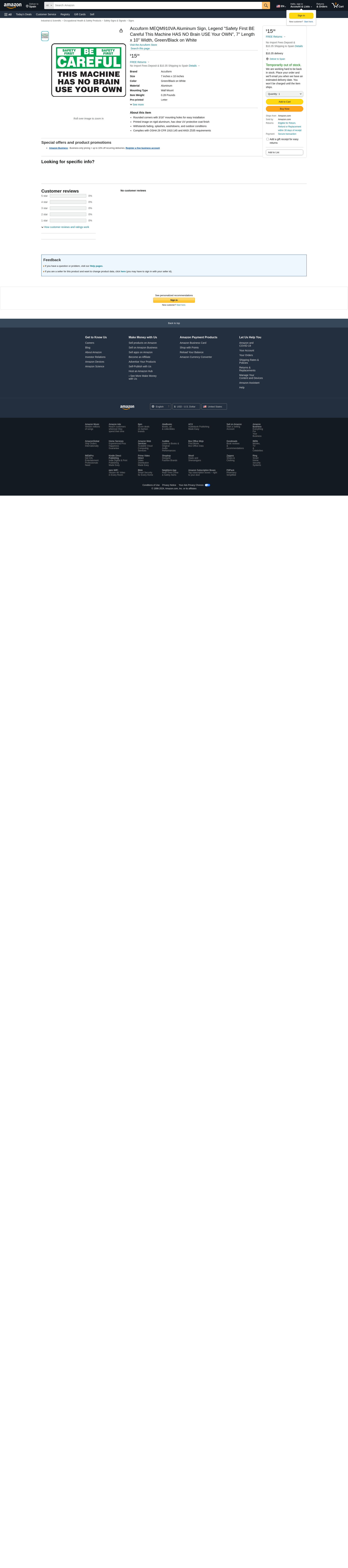 Accuform MEQM910VA Aluminum Sign, Legend "Safety First BE Careful This Machine HAS NO Brain USE Your OWN", 7" Length x 10" Width, Green/Black on White