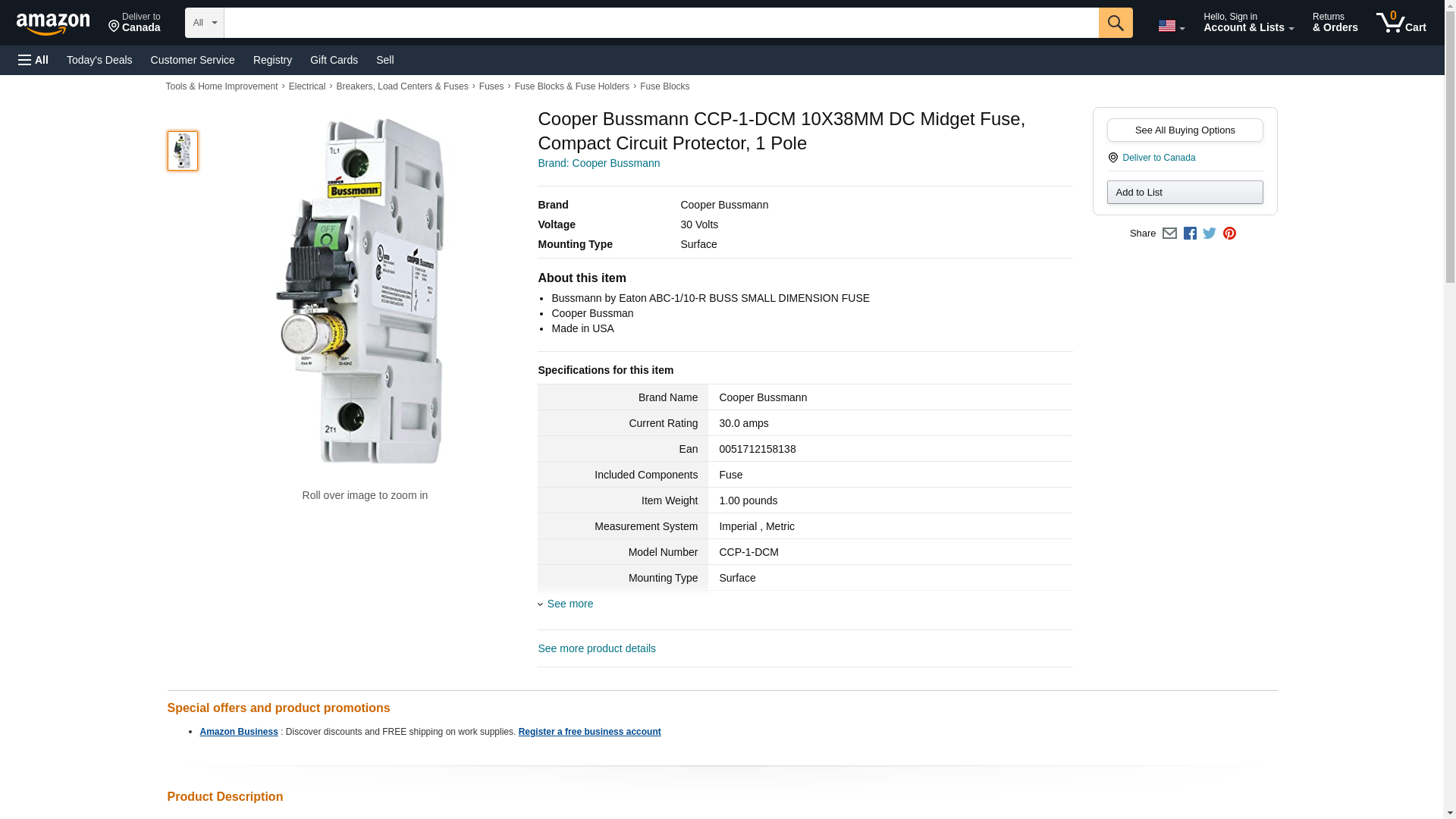 Cooper Bussmann CCP-1-DCM 10X38MM DC Midget Fuse, Compact Circuit Protector, 1 Pole