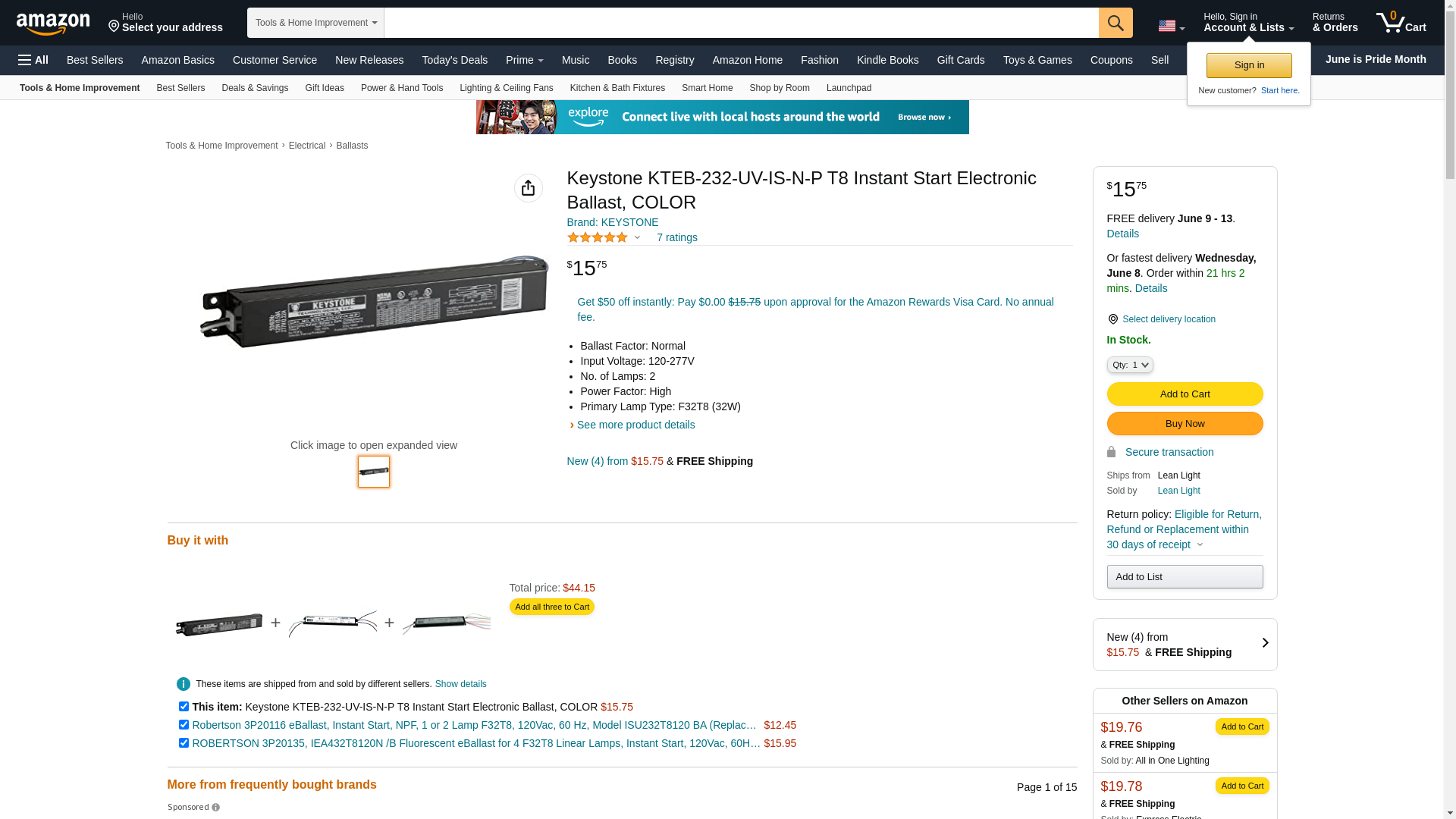 ![]() gordonelectricsupply.com | KTEB-232-UV-IS-N-P | 1 | Keystone Orders Over $150 Usually Ship Next Day, Otherwise 5-7 Days | 1 | 1 @ $25.29 |
