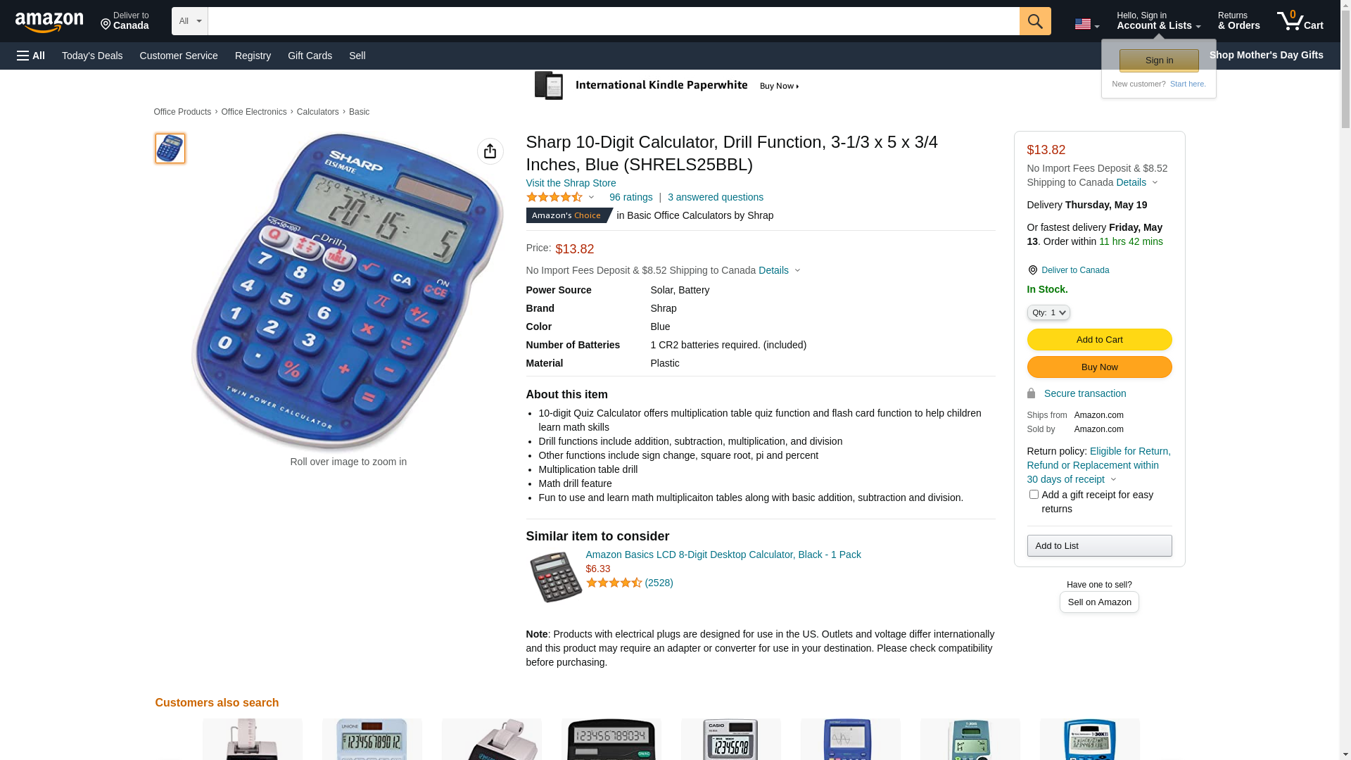 - Sharp 10-Digit Calculator, Drill function, 3-1/3"x5"x3/4", Blue