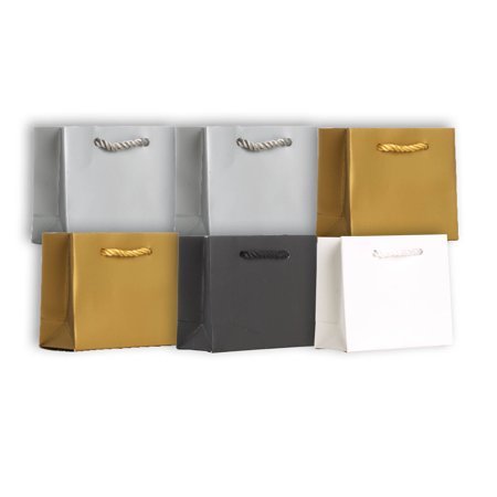5" wide x 4" high x 2" deep ; Luxurious matte finish, printed inside and premium nylon rope handle.; Made from 250 gsm thick paper